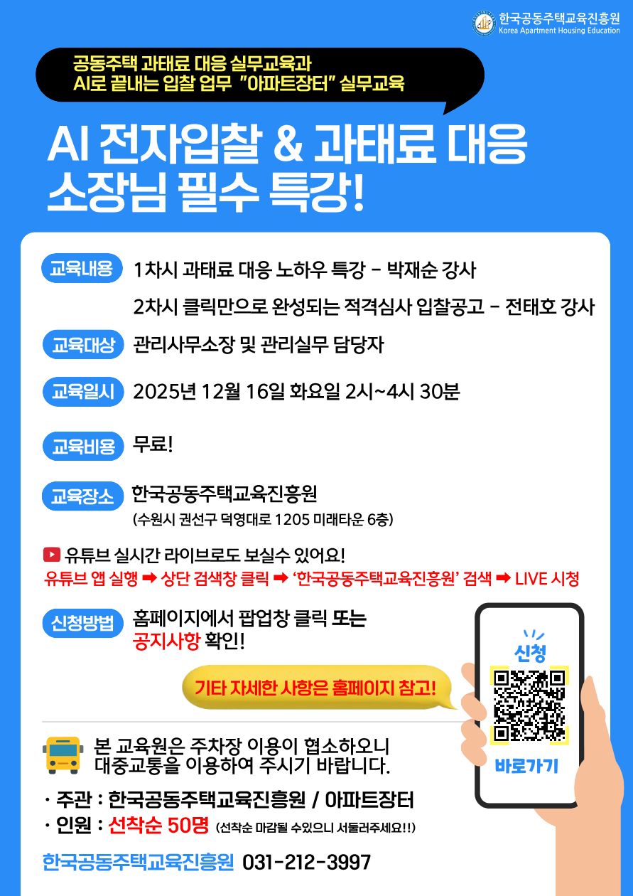 1) 입찰 업무의 자동화: AI 기술을 활용한 사업자 선정 업무 혁신 2) 아파트장터 시스템 시연 및 실습: (공고문) 빅데이터 분석을 통한 입찰 공고문 자동 완성 (심사) 딥러닝 기반 적격심사 평가표 자동 산출 (결과) 심사 결과와 연동된 회의록 즉시 생성 및 출력 3) 질의응답: 시스템 활용 및 입찰 실무 Q&A |