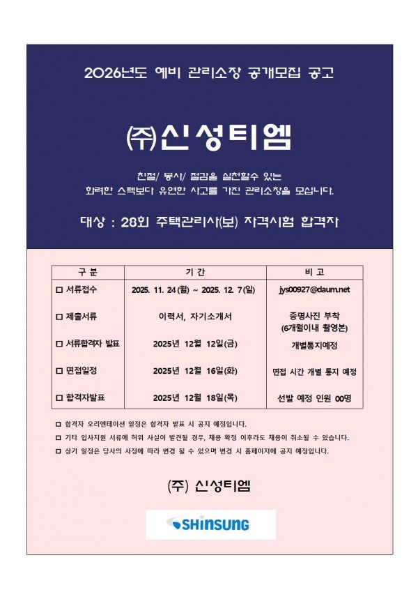 ㈜신성티엠 주택관리사 공개채용 안내